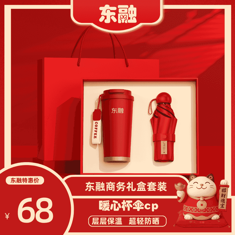 东融定制杯伞精装红盒礼盒,烫金 logo ,商务高端质感,杯伞甄选食品级材质与抗风面料,匠心工艺耐用又显档次,既显诚意又不失品位,价格实惠还性价比拉满,是维护客户、致谢合作伙伴的体面之选!商城售卖价68元。